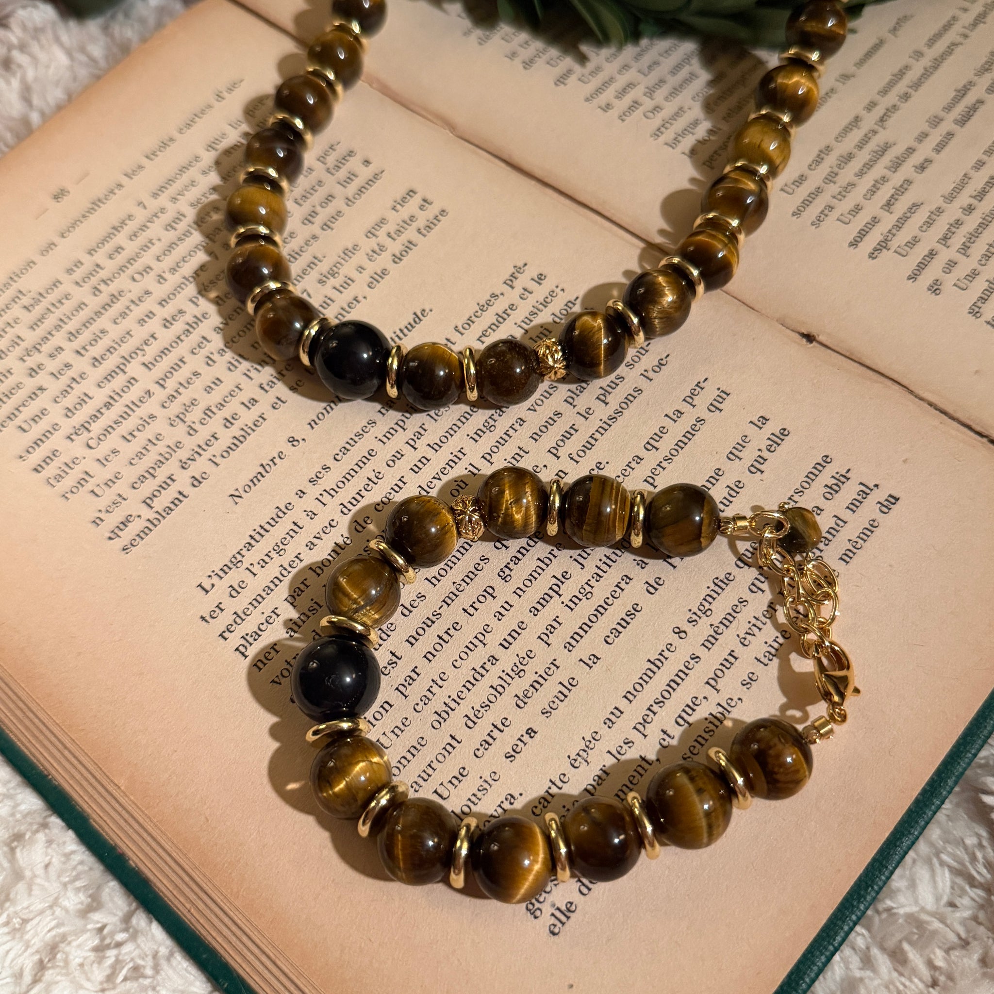 18KT Pleated Gold, Copper, Natural Tiger's eye and Silber Obsidian